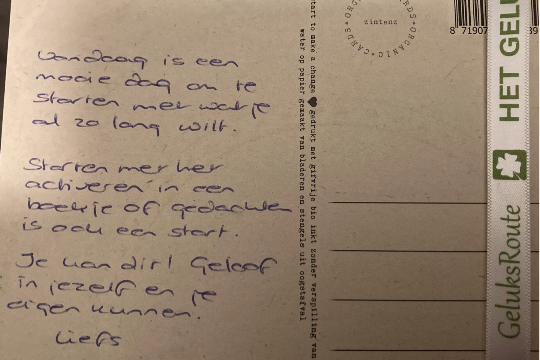 Ik bedank degene die deze mooie aanmoediging heeft achtergelaten bij de gelukscaravan.